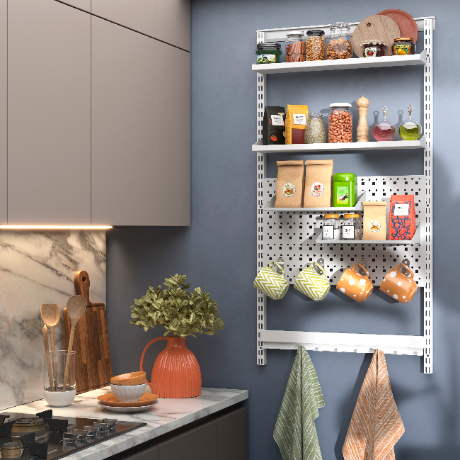 Гардеробная система ПРАКТИК HOME — это современный способ организовать рабочее пространство на кухне или в зоне столовой. В основе этой сборки лежит универсальная перфопанель, которая позволяет разместить мелкие аксессуары именно там, где они вам нужны. Особое внимание уделено полке, которая идеально подходит для хранения баночек со специями, соусов или декоративных элементов. Панель с крючками поможет удобно подвесить чашки, половники или лопатки, освободив место в выдвижных ящиках. Прочная металлическая конструкция легко моется и не впитывает запахи, что крайне важно для кухонной зоны. Благодаря модульному принципу, вы можете комбинировать элементы системы, подстраиваясь под размеры фартука или свободной стены. Все кухонные принадлежности теперь будут находиться в идеальном порядке и в быстром доступе во время приготовления пищи. Создайте функциональный и чистый интерьер с ПРАКТИК HOME, где каждая деталь продумана для вашего комфорта.
